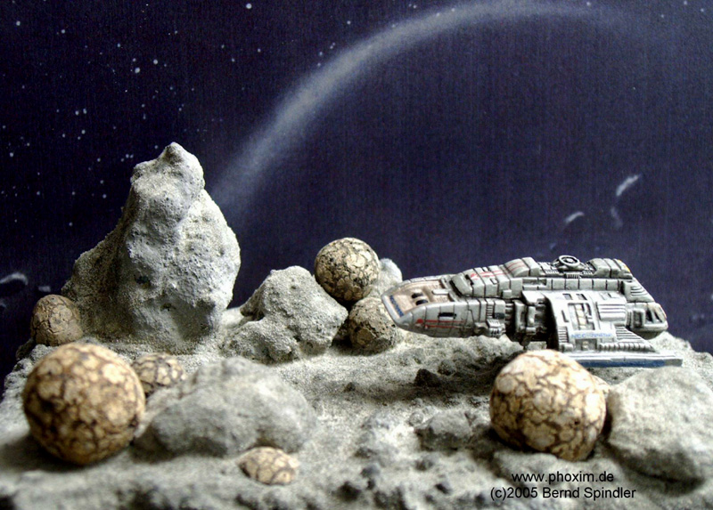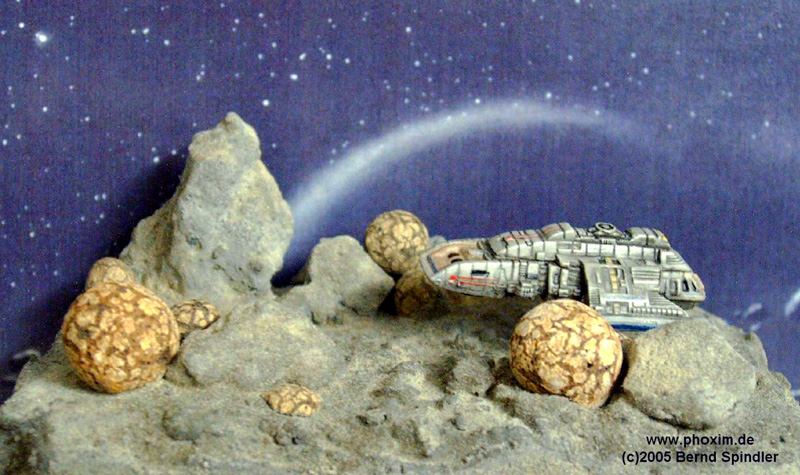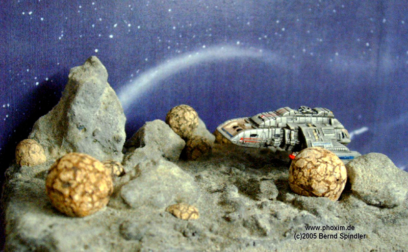 Hallo alle zusammen. Anbei einige Bilder von meinem Star Trek Runabout Diorama. Die Runabouts gabs hauptsächlich in DS9-Folgen und hatten unterschiedliche Namen. Am bekanntesten dürfte wohl die U.S.S. Rio Grande sein. Das Raumschiff ist von Micro Machines, die Basis (8x11cm) besteht (wie fast immer) aus Styropor, die Felsen sind echte Steine und die Kugeln Blähtonzubehör für Hydrokulturpflanzen. (Haben mir wegen ihrer strukturierten Oberfläche schon immer gut gefallen). |