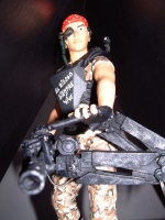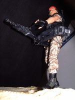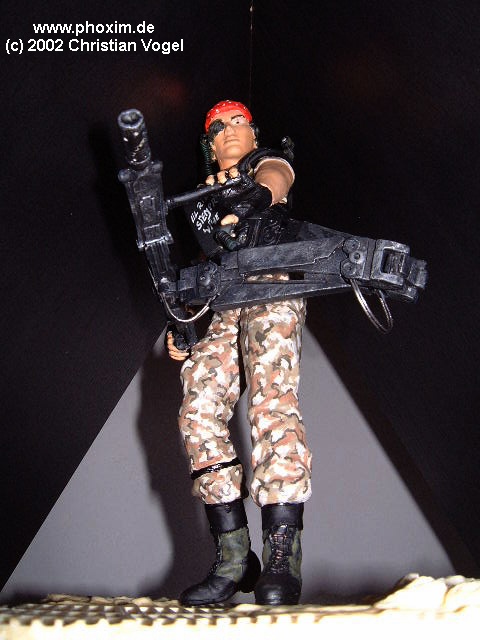 Ein paar Veränderungen musste ich auch noch vornehmen. Zu einem das Kabel von Headset abfeilen und durch ein anderes ersetzen und zum anderen Neuteile und Kabel an die Waffe ankleben. Mit der Farbgebung hab ich mich an den Film gehalten. Die Tarnhose war wirklich nicht einfach hinzukriegen. Dieser Stoff wurde auch extra für diesen Film entworfen. Reststücke gingen für Unsummen weg. Die Base stammt von Star Toys wird aber durch eine Geo Deluxe Base ersetzt. EL RIESGO SIEMPRE VIVE !!! ADIOS !!! |