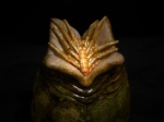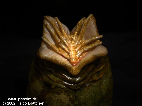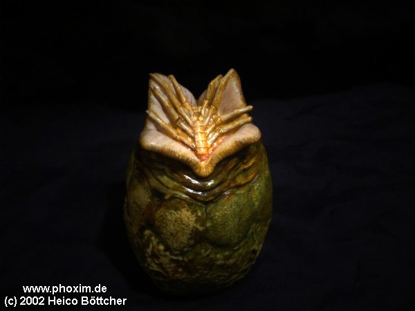 Dieses ca.10 cm große Alien Ei habe ich mit Drybrush angemalt und es ist mit Tamiya transparenten Farben bemalt worden. Den kleinen Facehugger, der aus dem Ei gekrochen kommt, ist wiederum mit dem Pinsel gewasht worden und dann wieder mit Drybrush, das gibt besonders gute Effekte. Auf Grund der Größe passt das Ei normalerweise sehr gut zu 1:6 Alien Modelle. |