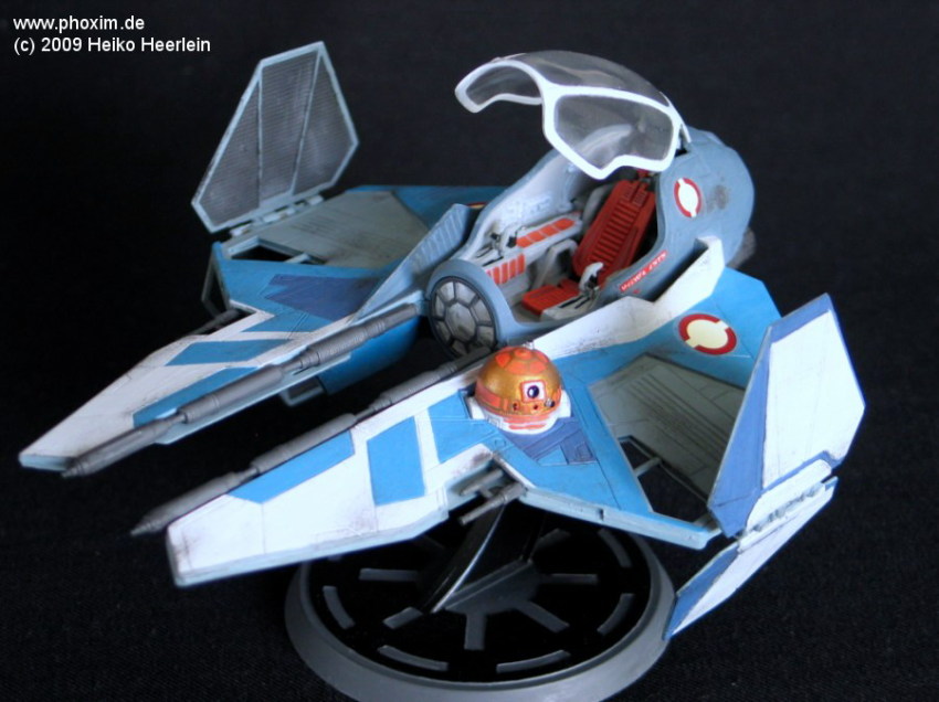 Und wieder ein Problem: Es liegen zwar Abziehbilder dabei, aber keinerlei Anleitung wo sie hinkommen. Blieb nur der Karton und die schon gebauten Starfighter von