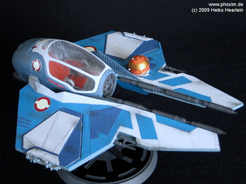 Also bekam der Fighter eine grauweiß-blau-dunkelblaue Außenhaut- bis auf die Pfanne für den Kugelkopf des Ständers, Lack würde da sowieso nur verkratzt. |