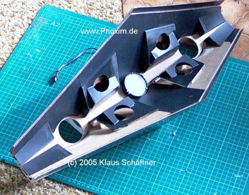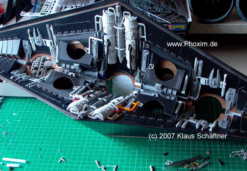 Bei der Fertigung der drei Haupttriebwerke bieten sich zwei Möglichkeiten: Entweder man baut eine Prä-Form, wonach man Abgüsse in Resin oder ähnliches herstellt ( siehe Lasse Hennings Stardestroyer auf seiner Webseite ). |