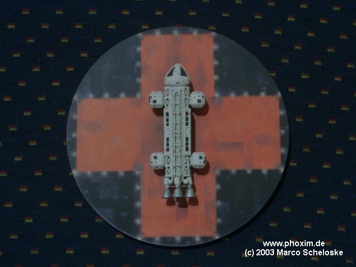 Daher bleibt es, wie es ist. Ich habe lediglich letztes Jahr die kleine Display-Basis zusätzlich gemacht. Das Original-Design stammt von Jim Small (USA) und ist ein Decal für sein Mondbasis-Alpha Diorama (NICHT das vor einiger Zeit wieder aufgelegte Modell, sondern ein komplettes Garage-Kit), er hat mir freundlicherweise erlaubt, Änderungen vornehmen zu dürfen und es für meine Zwecke zu benutzen (nicht nur das, er hat mir sogar ein paar Decals als Scanvorlage überlassen!). Ich habe das ganze vergrößert, einige Details hinzugefügt und dann auf eine runde 3 mm Spanplatte aus dem Hobbymarkt geklebt. Voila, fertig ist die Landeplatform - nicht ganz so hübsch wie die Resin-Version von Comet, aber dafür auch 120,- Euro billiger ;) ! |