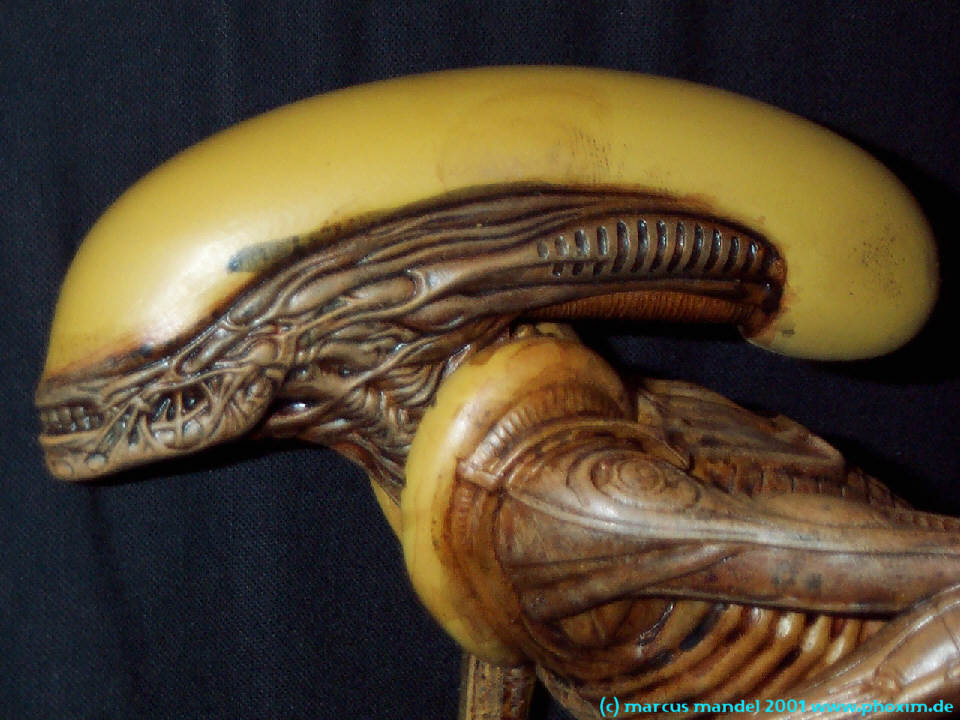 Hier seht ihr nun das endgültige Modell, an einigen Stellen habe ich noch schwarz aufgeprüht, um den Alien etwas interessanter zu machen, abschließend eine (nicht sehr dicke) Lage Glanzlack, fertig. Durch den Blitz beim Foto glänzt der Alien leider etwas zu stark, so extrem ist es in Wirklichkeit nicht. |