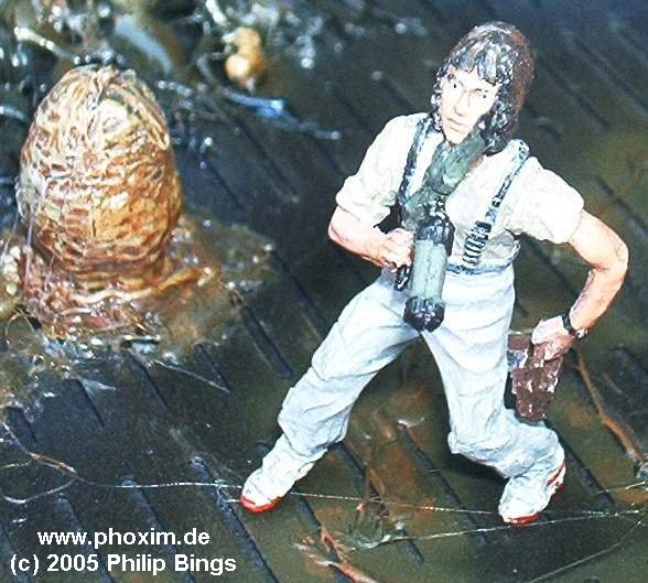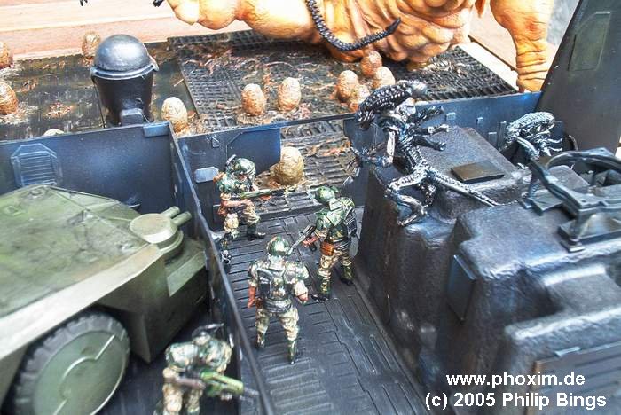 Demnach machte ich mir zunächst mal Gedanken welche Szenen man verbinden könnte, bzw. welche Szenen man parallel darstellen konnte. Die Modelle sind von AEF und Halcyon. Das Queen-Diorama und ein APC nebst Marines sollten auf jeden Fall verbaut werden, deshalb boten sich 2 Szenen an: Die Ankunft der Marines, wie der APC in die Mauer kracht sowie Ripleys erste Begegnung mit der Alien Queen (The Bitch). |