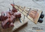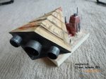Der Frighter - ist einfach aus mehreren Schichten Karton aufgebaut. Zuerst habe ich die Form am Reißbrett vorgezeichnet - dann auf Karton übertragen und die Grundform zusammengeklebt (beim 3. Versuch war ich mit dem Ergebnis zufrieden). Danach 2 Lagen mit immer kleiner werdenden Kartonflächen über diese Grundform gelegt um die Oberfläche zu strukturieren. Bemalt und geweathered wurde mit Acrylfarbe, die Glanzlichter sind weißer Buntstift. Ergänzt mit Düsen aus den Plastikkapseln welche immer über den Lunten der Silvesterraketen stecken ( zum Glück schon schön Silberfarben ) nur mit Schwarz gealtert. |