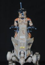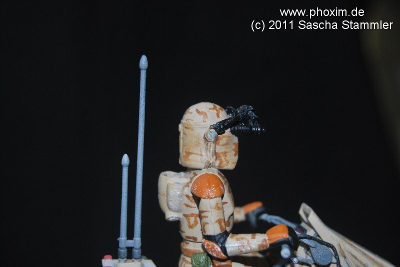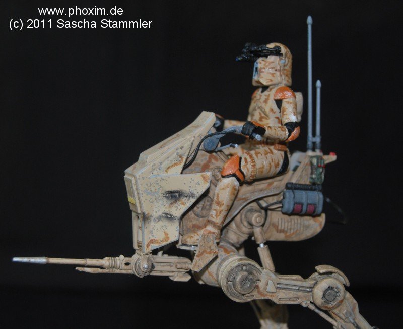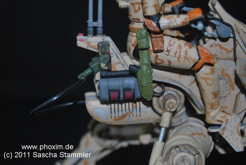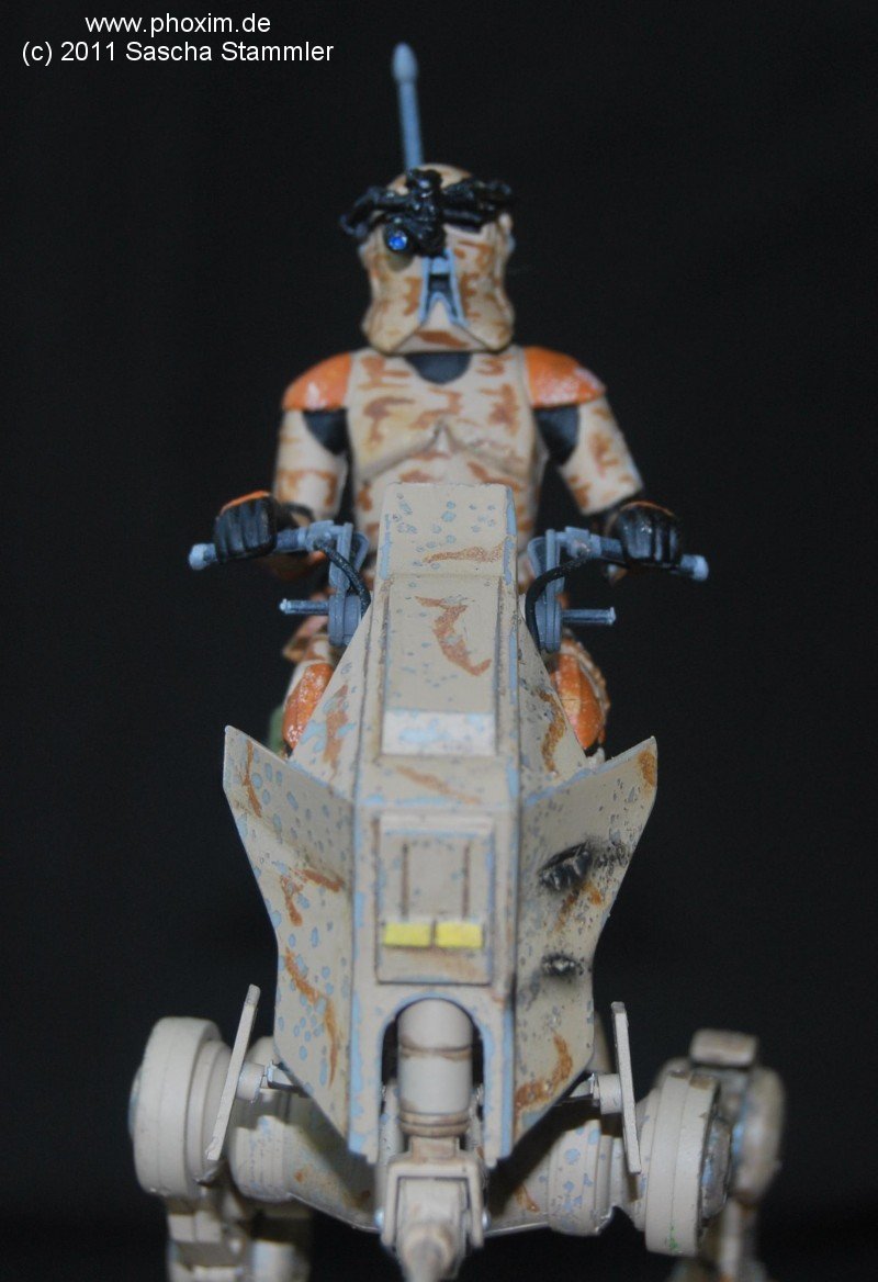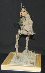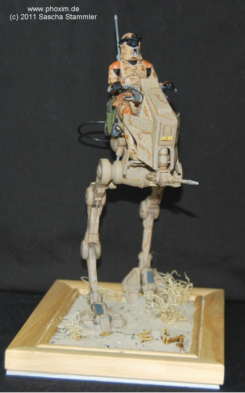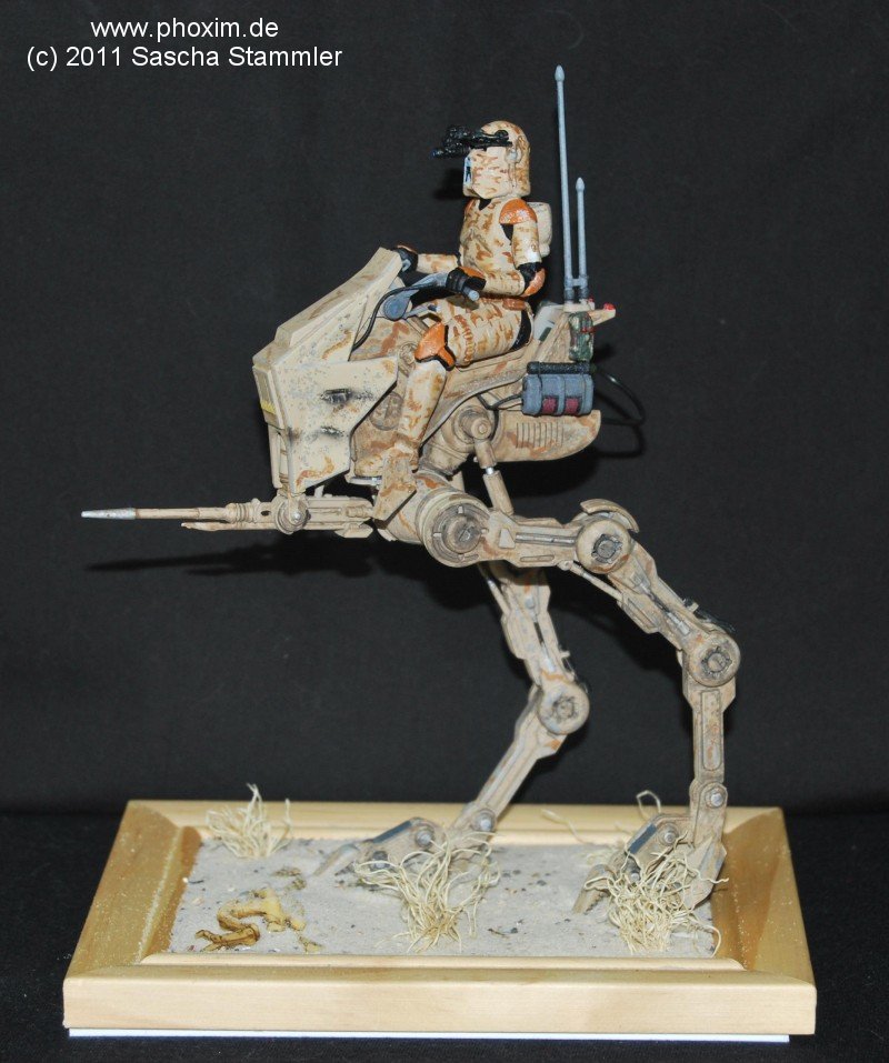 Dies ist mein zweiter Bausatz den ich gebaut habe. Ich konnte durch meine Community einige Modellbau Methoden ausprobieren und erfolgreich umsetzen. Der Bau war für mich ein wichtiger Schritt und ein kleines Abenteuer. Da der Snapfix Bausatz von Revell nicht viele Details hat, beschloss ich diese selber hinzuzufügen. Vom ersten Moment an war mir klar, dass es schon zu viele Standard AT-RT gebaut wurden. Also sollte meiner etwas Anderes werden. Mein Entschluss war gefasst: es sollte ein AT-RT werden, der nur auf einen Wüstenplanet als Späher eingesetzt wird. Nur, weil man ihn so nicht in den Filmen gesehen hat, heißt das ja nicht das es ihn so nicht gibt. Also fasste ich all meinen Mut zusammen und setzte mich an das Modell. |