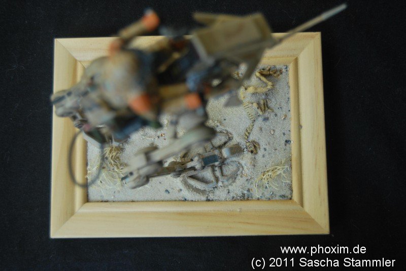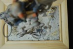Vignette: Die Vignette wollte ich einfach gestalten. Ein Bilderrahmen diente dabei als Base. Diesen habe ich dann mit gewöhnlichen Vogelsand bestreut. Die kleinen „Steinchen“ waren von vorn herein im Sand enthalten und dienen auch als schöne kleine Detaillierung.