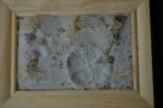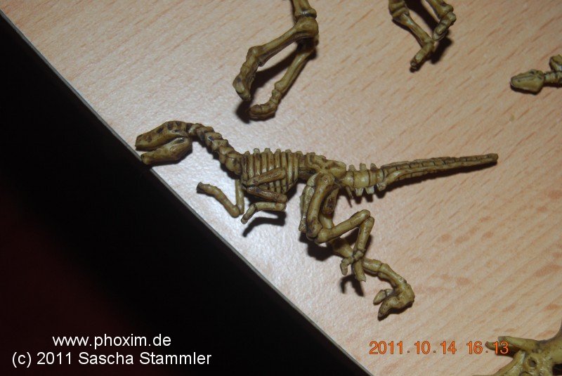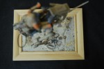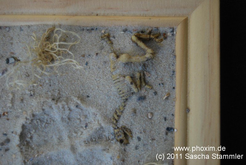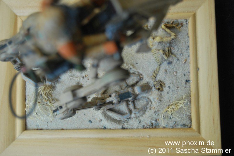 Ich erstand ein Dinosaurier Skelett für Setzkästen welches ich halbierte und auf die Vignette legte. Den Läufer habe ich dann benutzt um vorab schon Fußabdrücke in den Sand zu machen. Das Skelett schnell noch mit Sand bestreut. |