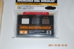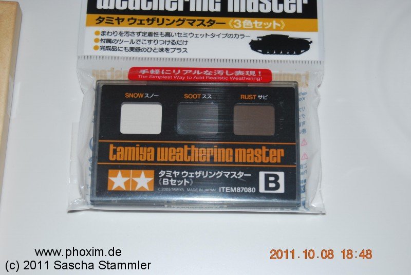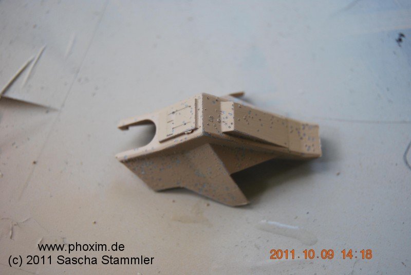 Mit Hilfe meines Dremels bohrte ich zwei Einschüsse in die Front. Das Ganze habe ich dann mit Tamiya Ruß Pigmente verfeinert. Die Batterietaschen habe ich mit matt Grau Trocken gemalt und anschließend mit der Sandfarbe weit entfernt benebelt. |
