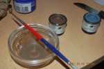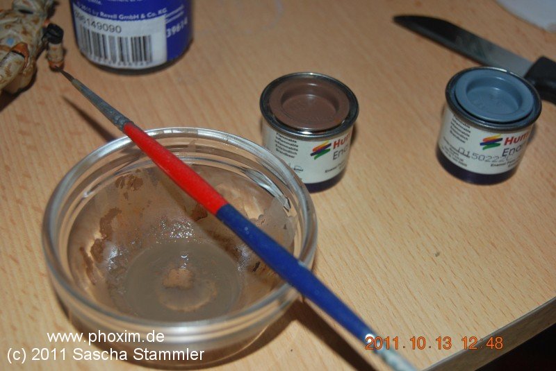 Das ganze musste ca. 10 Minuten trocknen. Danach habe ich mit der Tamiya TS-68 Sandfarbe darüber lackiert. Die Acrylfarbe ließ ich 15 Minuten trocknen und habe dann mit Revell Emaille Farbe matt Braun 188 das Camouflage leicht verdünnt aufgetragen. Dies habe ich bewusst nach Handlackierung aussehen lassen. Nachdem diese dann eine Stunde getrocknet waren nahm ich einen Pinsel mit harten Borsten und pinselte das Salz samt der Farbe darauf ab. Dies sah dann aus wie abgeplatzter Lack der von dem Wüstensand und Wind quasi Sand-gestrahlt wurde. |