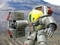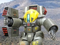 „Dorvack“ war der Versuch, mit dieser Popularität mitzuschwimmen, und im Kern dreht sich die Serie um eine Invasion der Erde durch Außerirdische, die mit technischem Gerät zurückgeworfen werden. Dazu gehören auch die sog. „PAs“, „Powered Armors“, die in der Optik sehr an Tiefsee-Tauchanzüge erinnern und das Gros der irdischen Bodenkräfte darstellen. Designt wurden die Dorvack-Mecha von Katsumi Itabashi and Nobuyoshi Habara. Und wer sich an Kow Yokoyamas Ma.K./ZbV3000/Maschinenkrieger-Universum erinnert fühlt: die Dorvack-PAs sind tatsächlich älter und haben ihn und auch andere (s.u.) tatsächlich stark inspiriert. ;-) |
