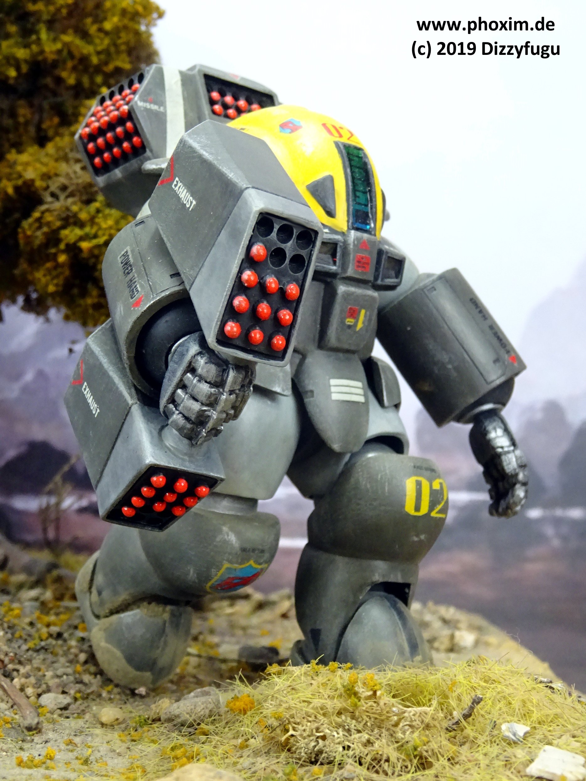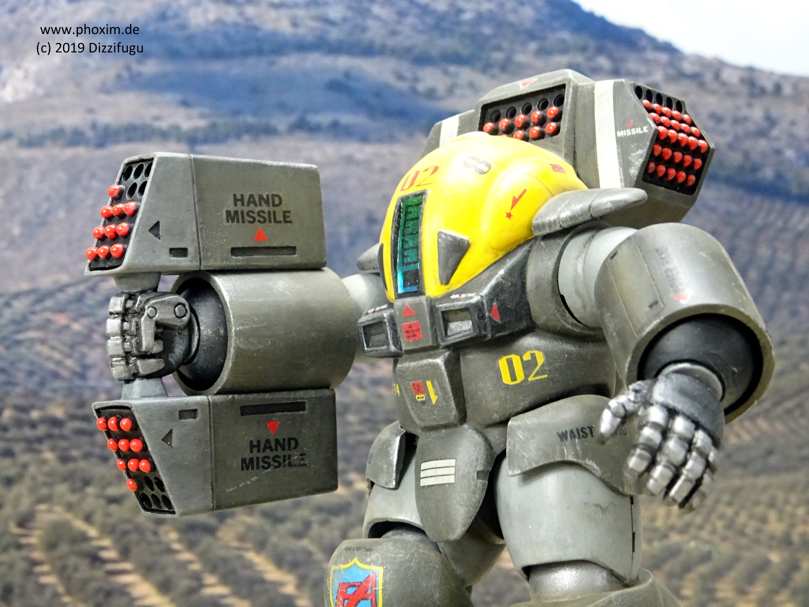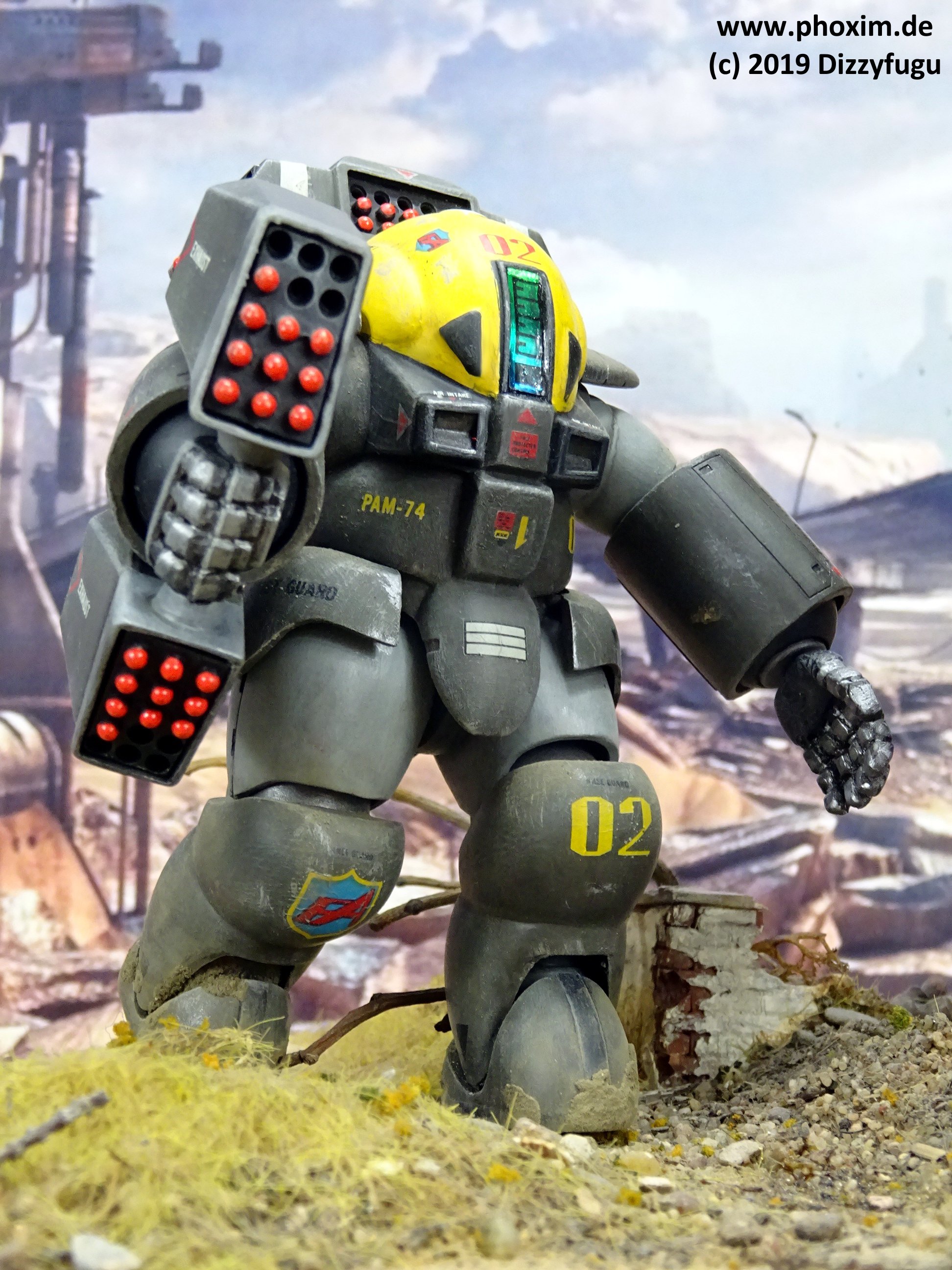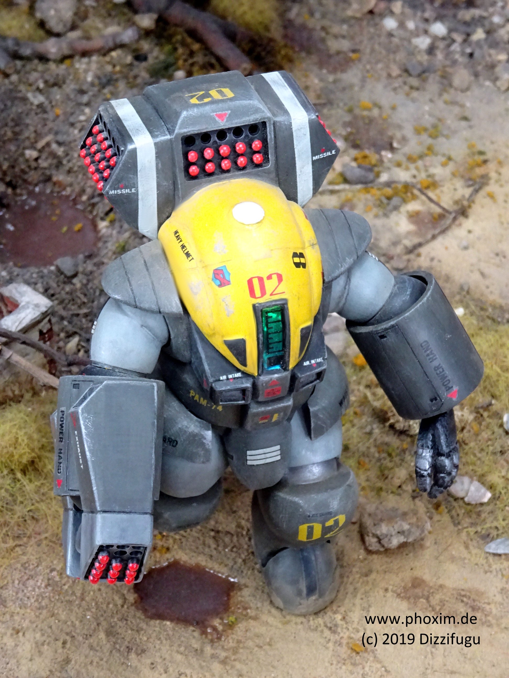 Bemalung und Markierungen: Der PAM-74 erhielt seine authentische Lackierung in einem einheitlichen olivgrünen Farbton mit hellgrauen Oberarmen und Beinen sowie einer gelben Helm-Luke - für die Dorvack-Modell-PAs ist dies ein ziemlich gedämpfter Look. Andere PA-Modelle kommen z. B. in rot, blau oder sogar lila daher, während die Original-PAs in der Serie selbst i.d.R. eher unauffällig (uni olivgrün) sind! |