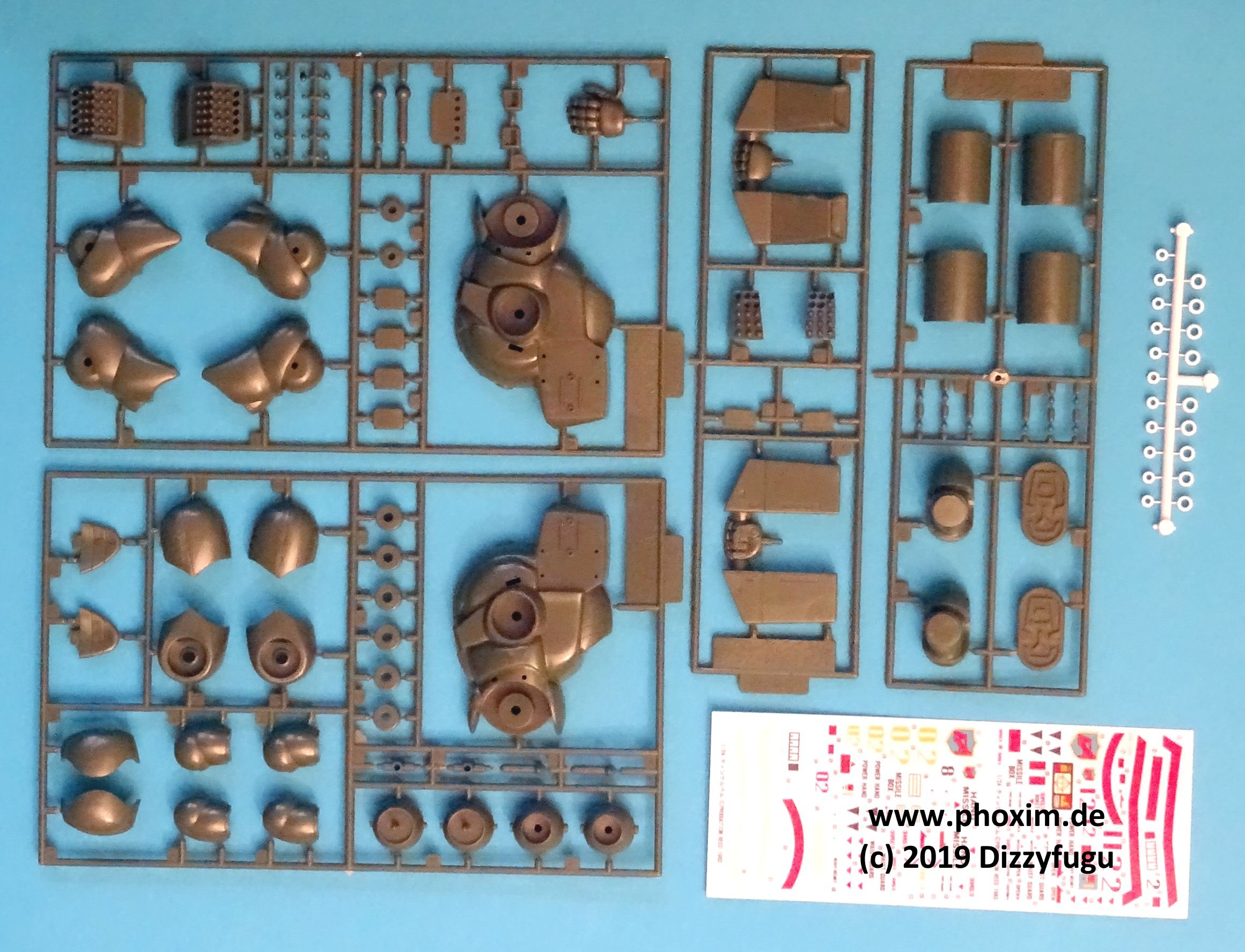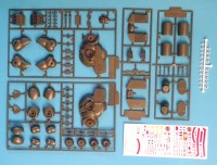 Massstab: 1:24 Teile: Ca. 85 Einzelteile an 4 einfarbigen Spritzlingen fürs Grundmodell, plus ein Extra-Spritzling für die Handfeuerwaffe sowie ein Satz Vinyl-Polycaps für die Gelenke. Anleitung: Gut bebildert, leicht verständlich, aber es fehlen Angaben zur Decal-Platzierung. Farbangaben entsprechen Gunze Aqueous Color Farbsystem. Decals: Ein erstaunlich umfangreicher, gut gedruckter Bogen Wassergleit-Decals. |