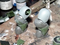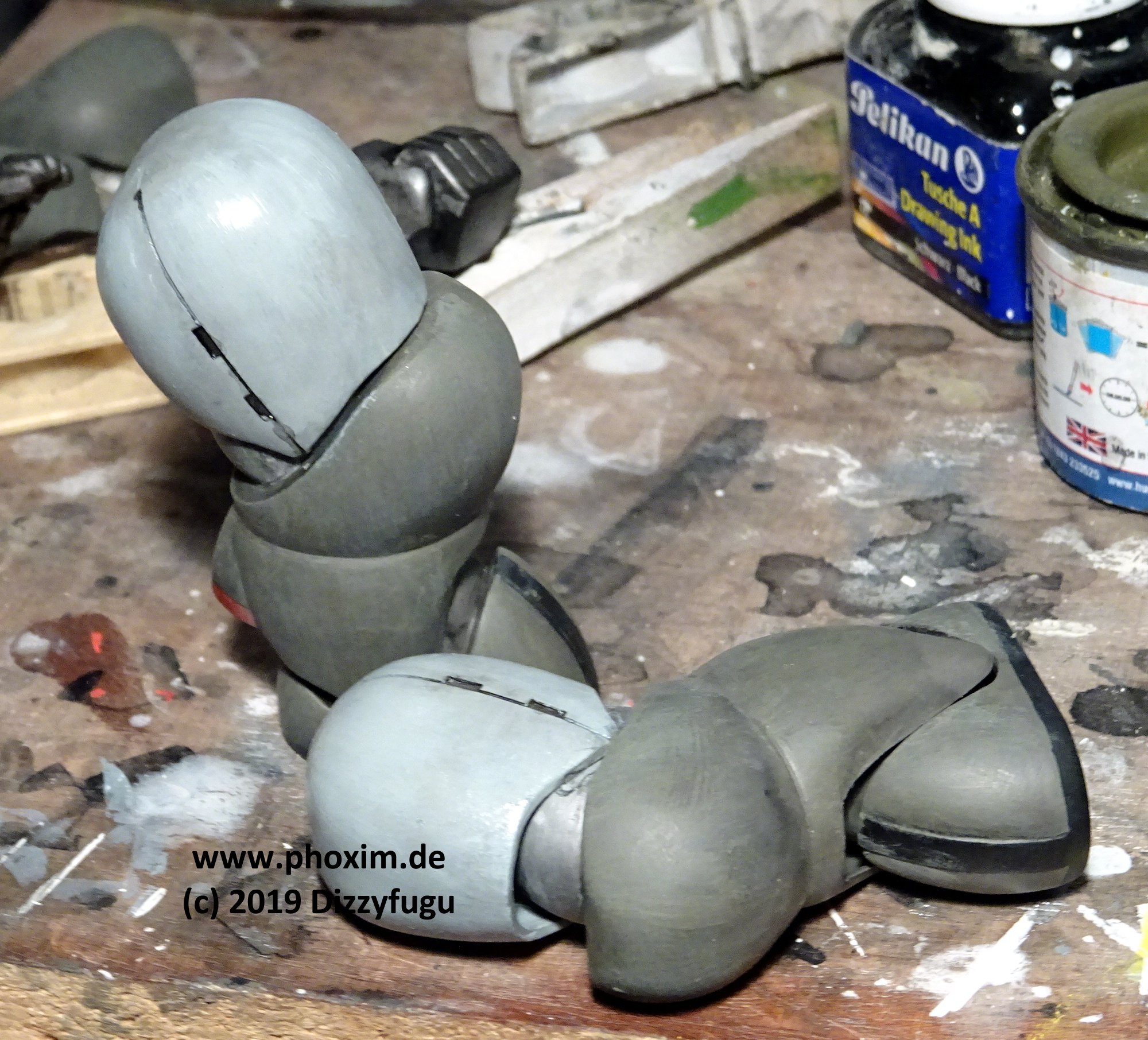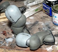Leider ist die Passgenauigkeit nicht so dolle. Dies heißt nicht, dass nichts zusammen passen würde, aber man kommt um ordentliches Schleifen und Spachteln nicht herum. Durch den damals typischen "Schale auf Schale"-Aufbau des Modells muss man immer wieder einzelne Bauabschnitte bearbeiten und z. T. auch vor der Montage bemalen, weil dann wieder neue Teile dazu und als Schichten drüber kommen, so dass viele Stellen an den Arm- und Beingelenken unzugänglich machen. Allerdings lassen sich Arme, Beine und Rumpf seperat fertigstellen, um dann schließlich eine Action-Figur zusammenzustecken. Die Gelenke funktionieren, dank der Vinyl-Einsätze, sehr gut, auch wenn die Beweglichkeit insgesamt etwas eingeschränkt ist. |