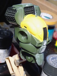 Der grüne Ton ist Tamiyas "Khaki Drab" (XF 51), was ggü. dem Vorbild zwar etwas hell ist, aber ich wollte einen guten Kontrast vor allem zum Schwarz am Rumpf. Der Helm wurde mit Humbrol 69 (Gloss Yellow) bemalt, die grauen Teile an Beinen und Armen wurden mit 36414 (Flint Grey, Modelmaster 2037). |