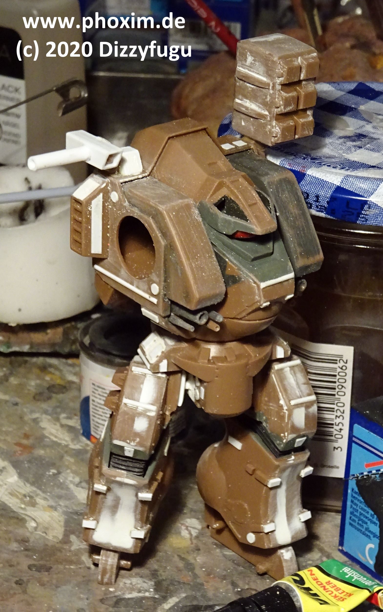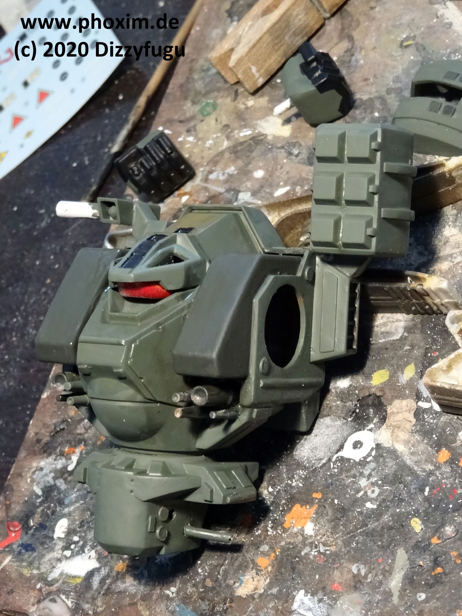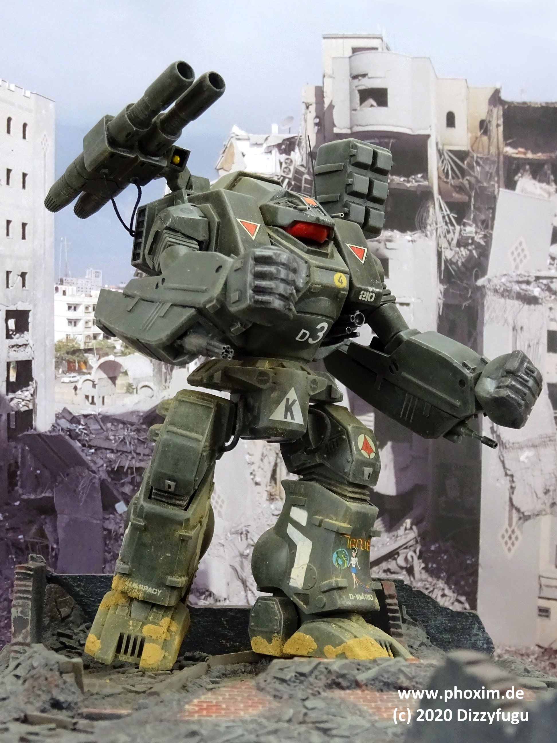 Konzept und Montage: Nach langer Zeit habe ich mich wieder einmal einem Macross-Mecha-Kit gewidmet – meine Einstiegsdroge in den späten Achtzigern in das Genre! Allerdings wurde dieses Modell, ein 2012er-Bandai-Re-Issue des Imai-Kits von 1982, nicht OOB gebaut, sondern verändert – einmal konzeptionell, um eine frühere Version des Destroid Tomahawks darzustellen, die in offizieller Quellenliteratur erwähnt wird, und es wurden auch einige Verbesserungen gemacht, denn dieser alte Bausatz an sich hat ein paar Problemzonen. |