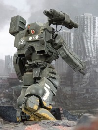Mit diesem Kniff konnte eine viel dynamischere und "natürlichere" Beinhaltung erreicht werden, auch dank der großen Füße des Tomahawks, die einen stabilen Stand auch auf nur einem belasteten Bein erlauben. Diese Tuning-Maßnahme verbessert das Modell m.E. bereits erheblich.Eine weitere Änderung betrifft die Bewaffnung des Tomahawks, die OOB ja ziemlich beeindruckend ist. Da meine fiktive frühe Mk. III-Version ihre Hauptwaffen an den Unterarmen verlor, beschloss ich dem Tomahawk mindestens eine andere große Schusswaffe auf der Schulter zu spendieren. |