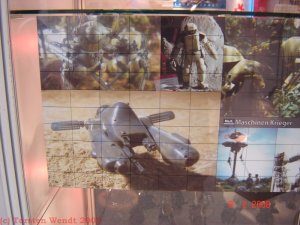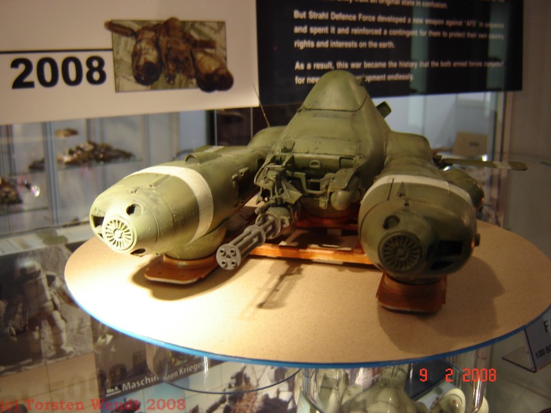 Die verschiedenen Kampfanzüge und der Kampfläufer Kröte waren von verschiedenen japanischen Modellbauern erstellt worden. Die Präsentation war wohl eher dazu gedacht einen Überblick für die Messebesucher zu geben, als die Modelle zu zeigen, welche letztendlich produziert werden. |